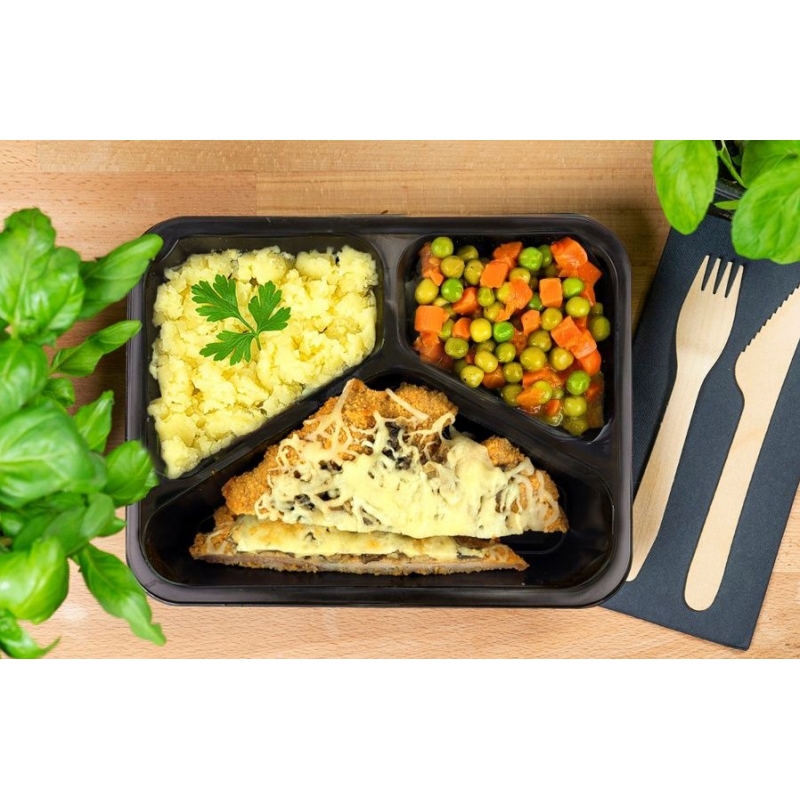 Schab zapiekany z pieczarkami i serem podany z puree ziemniaczanym oraz marchewką z groszkiem