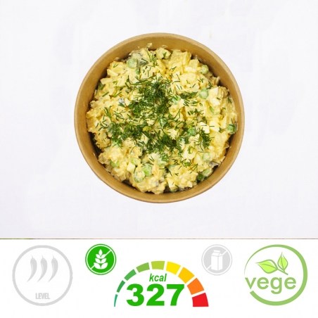 Składniki: Ziemniaki (43%), JAJA KURZE Gotowane i Obrane (Woda, Sól, Regulatory Kwasowości: Kwas Cytrynowy, Kwas Octowy, Kwas Mlekowy) (19%), Ogórki Kiszone (Ogórki, Woda, Sól, Przyprawy W Tym GORCZYCA) (14%), Majonez Domowy (Olej Rzepakowy, Pasteryzowane Żółtka JAJ, Musztarda (GORCZYCA)), Groszek Zielony (9%), Musztarda (Woda, GORCZYCA, Ocet Spirytusowy, Sól), Cebula Biała, Pieprz Czarny, Sól, Koper (1%) Ogrodowy